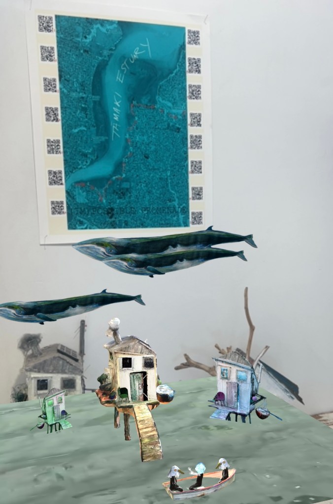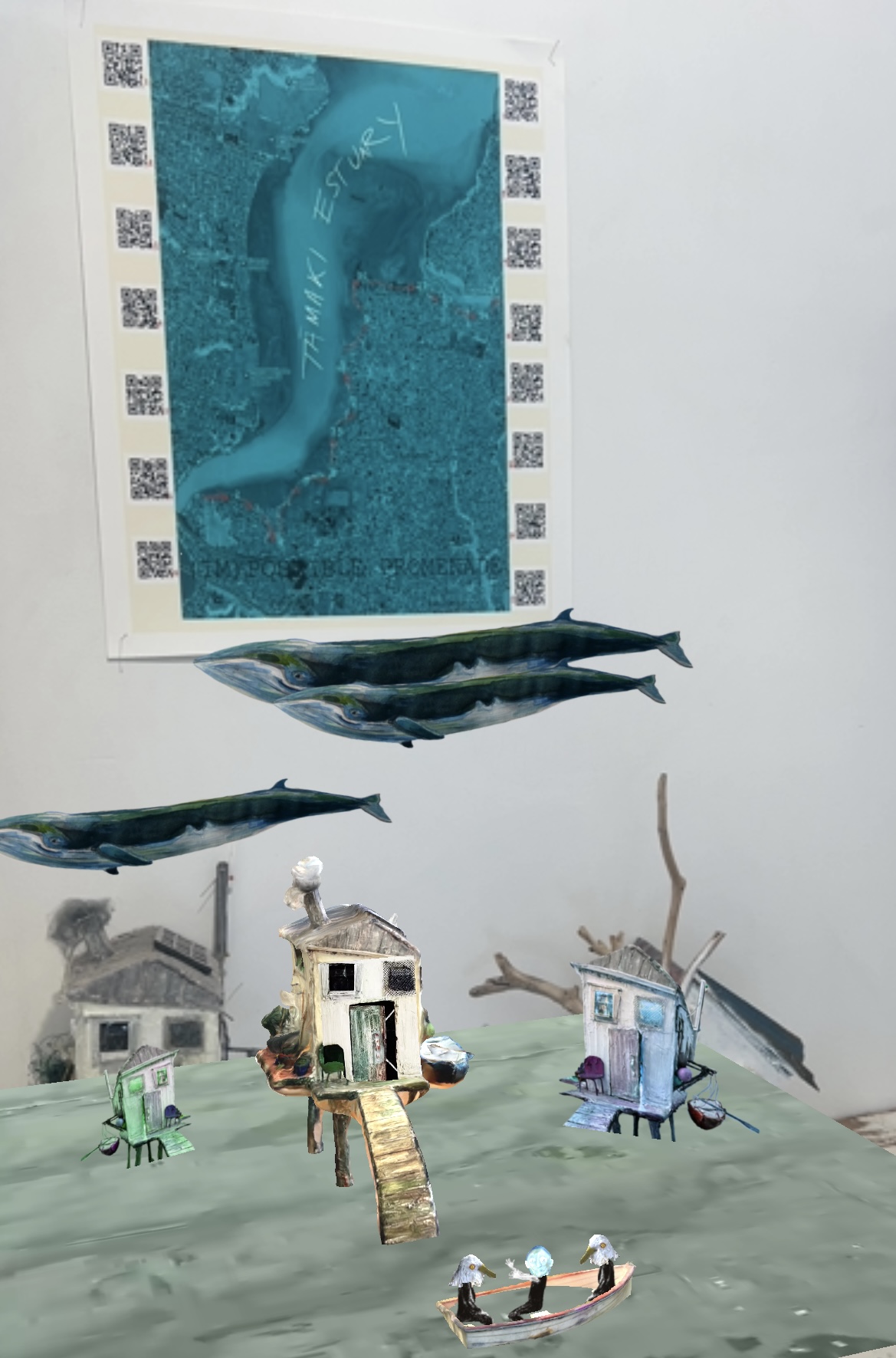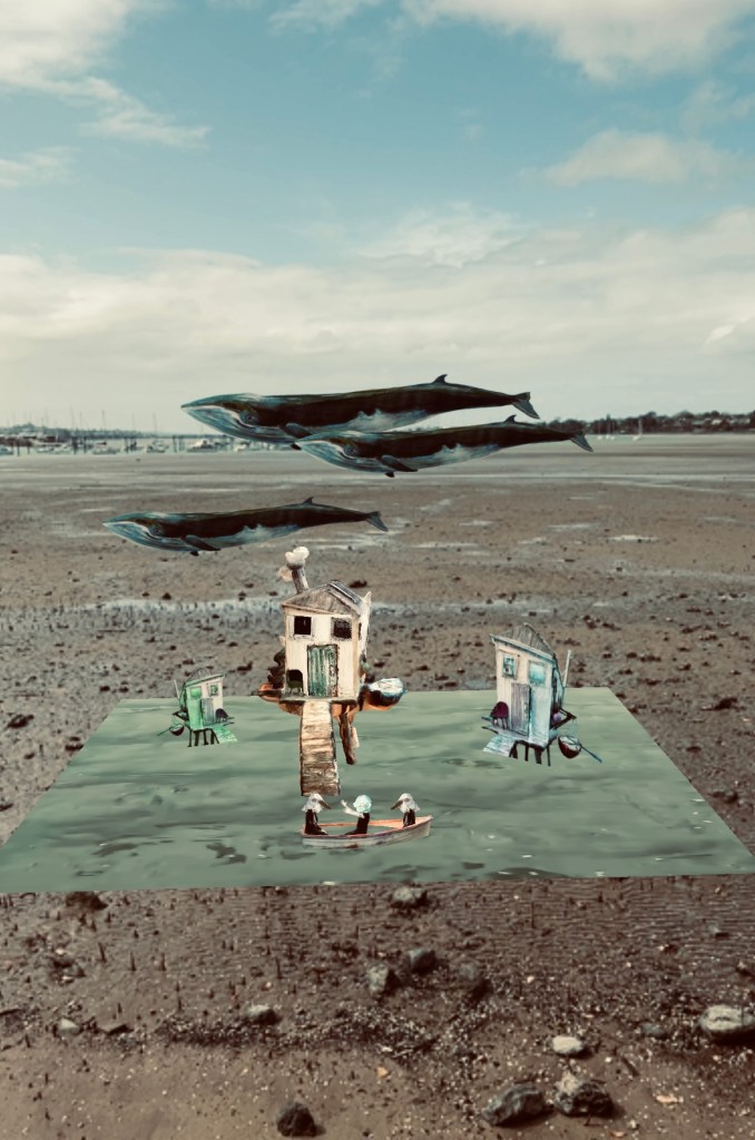 Commisioned by the Urban Walking Festival ‘(Im)possible promenade’ is a trail of surreal, augmented reality curiosities that respond to and question human’s relationship to nature and the surrounding Tamaki Estuary environment. Inspired by games, toys, miniature theatres, and wonder rooms the curiosities ask us to play and perhaps imagine alternative futures. A hamburger floats above cows, in the historic stockyards, speaking of the now suburban landscapes and a call to shape the future. A boat house, adapted to rising seas, harks back to a simple life where consumerist desires were kept at bay and we lived in full feeling of the elements. A door, signed ‘nature’ leads us in both directions to the same site questioning the dualism entrenched in our systems.