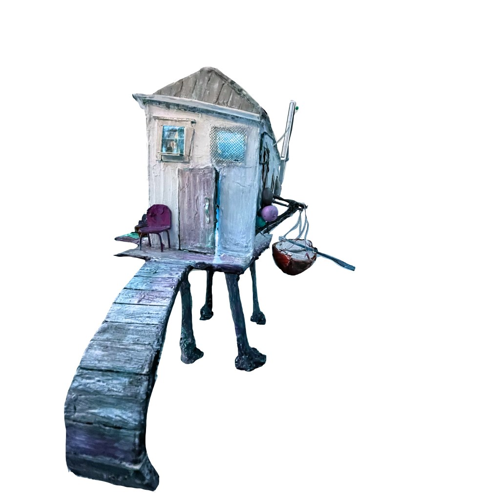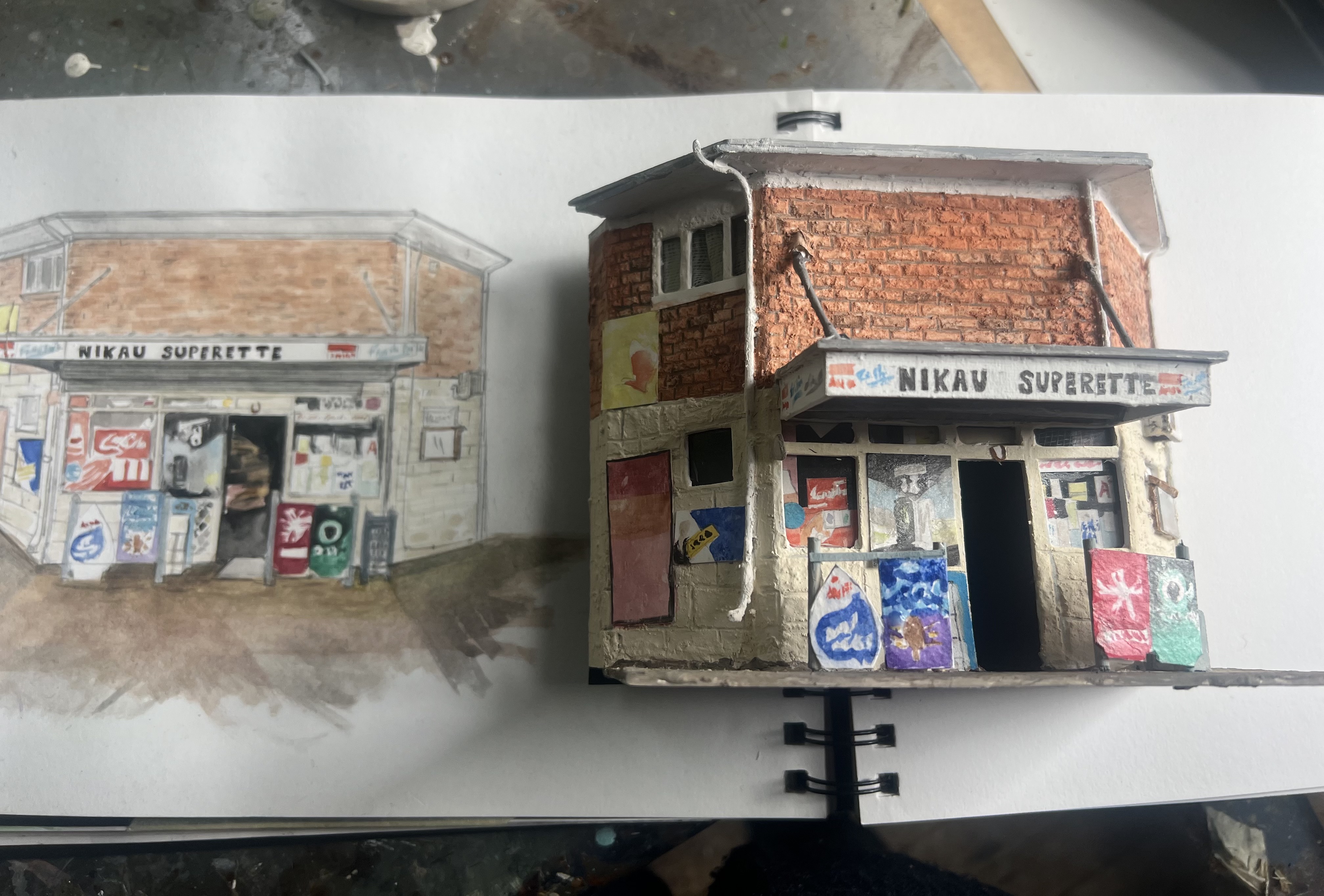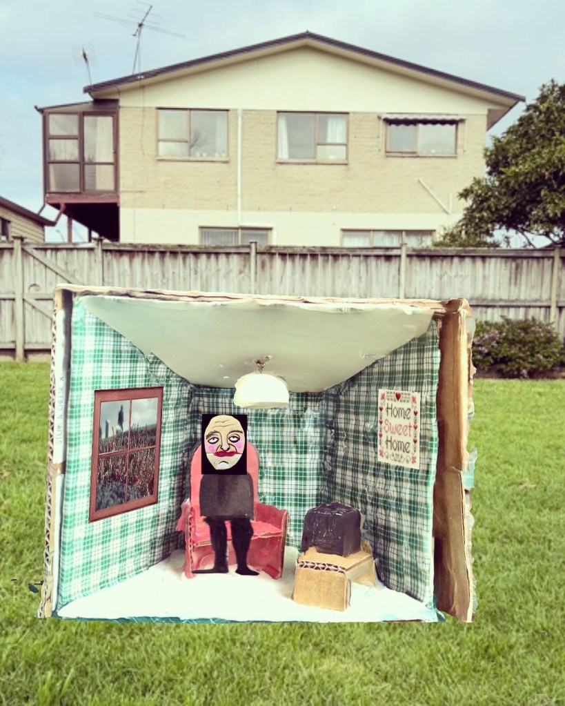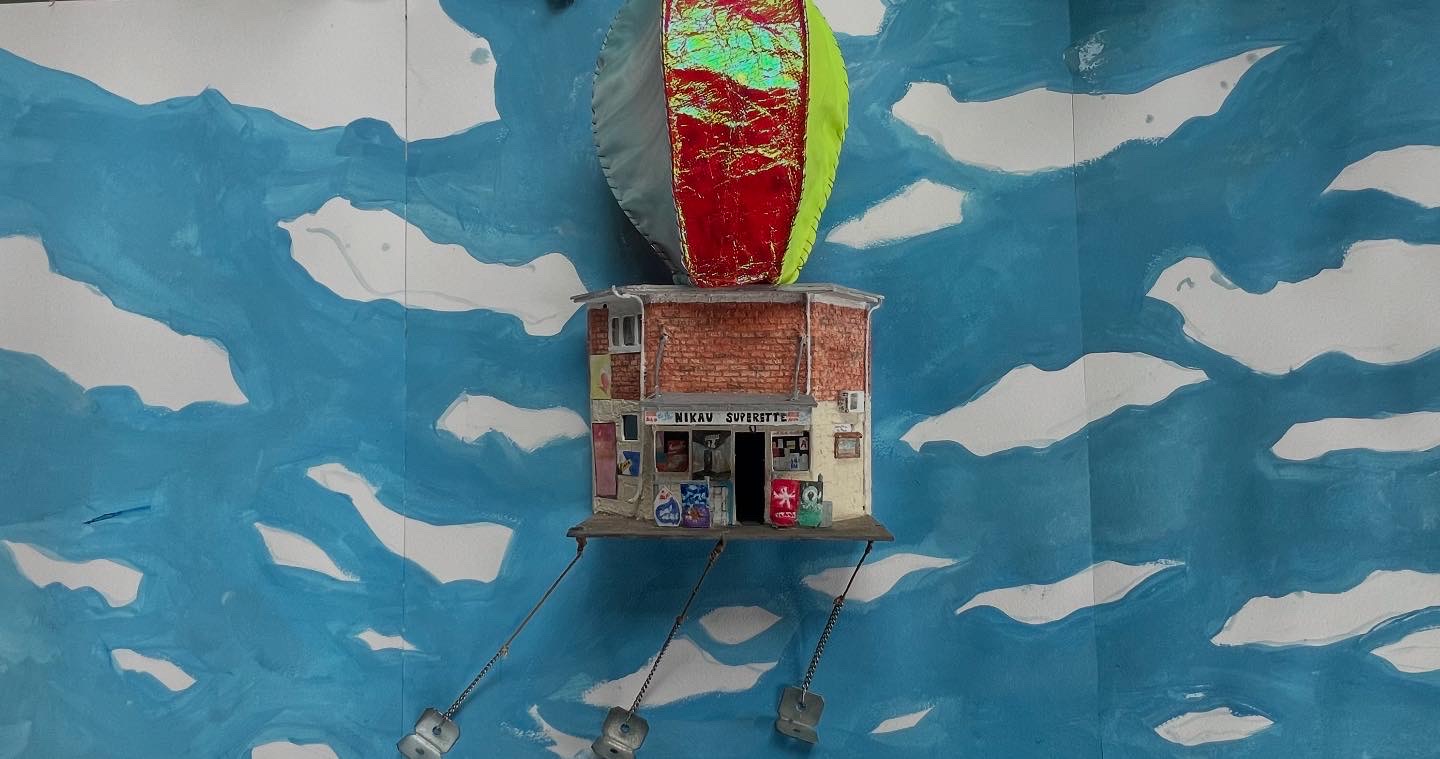 Participating artist for Season 4, exhibition 3. https://nikausuperette.art/season-four/exhibition-three/The diorama installed at Nikau Superette imagines the dreams and fears of the building and perhaps its occupants. The shop is in threat of being displaced by the large malls/shopping centres/supermarkets. It is being pulled up by a large shiny developer’s balloon. Crossing an unreal sky of blue and fluffy clouds and heading for a ‘better world’ its drop lines (roots) claw towards the ground. As we shift further into a monopolised, homogenised and digital world the emotions of the building perhaps reflect the feelings inside of us – attempting to hold onto the important values of our past and being drawn towards ‘progress’ and new technology with unease. Our humanity and landscapes are swiftly shifting. Can our roots grow strong, in new and wonderful ways, amongst this onslaught of change? The diorama mixes 3D, 2D and Augmented Reality elements.