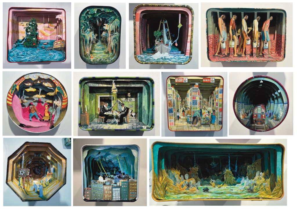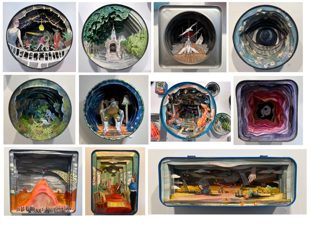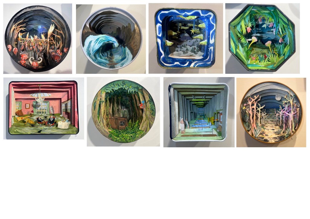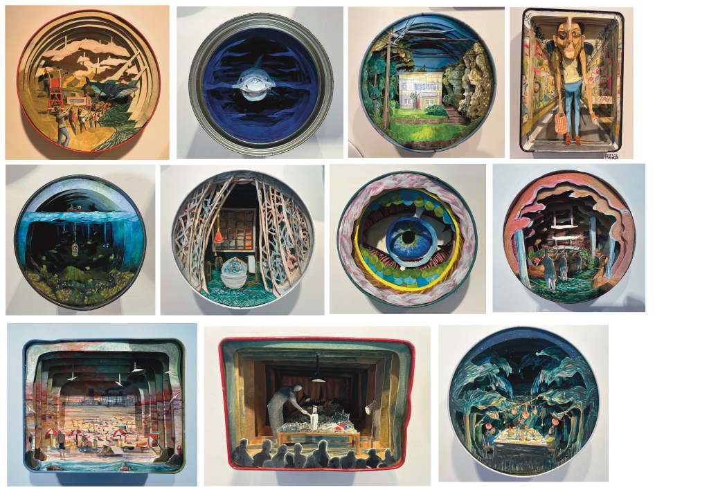 The humble biscuit tin transforms into a portal, offering an escape to other worlds. Drawing inspiration from peephole dioramas and toy theatres, painted paper cutouts fill many tins, creating hidden landscapes and interior spaces. Collected from dumps, charity shops, and gifted, these tins are reminiscent of a bygone era when we shared, preserved, and delighted in occasional rare treats, now seem outdated in our era of abundance. With a naive style and dark humour, this installation speaks to a yearning for a nostalgic past, juxtaposed with a contemplation of our environmental future.